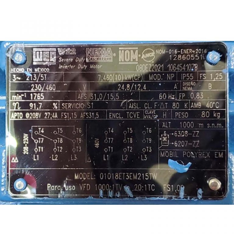 Requiere mas informacion sobre MOTOR ARMAZON 215T HP=10 RPM=1750 V=208-230/460 HZ=60 W22 01018ET3EM215TW MARCA WEG? Pulse enviar mensaje para contactar a un asesor.