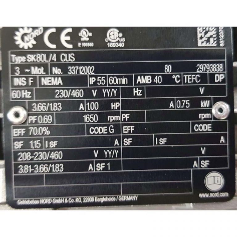 MOTOR 80L4 CUS 4P 0.75KW 230/460 V 60HZ ISCL F IP55 NP 33712002 MARCA NORD