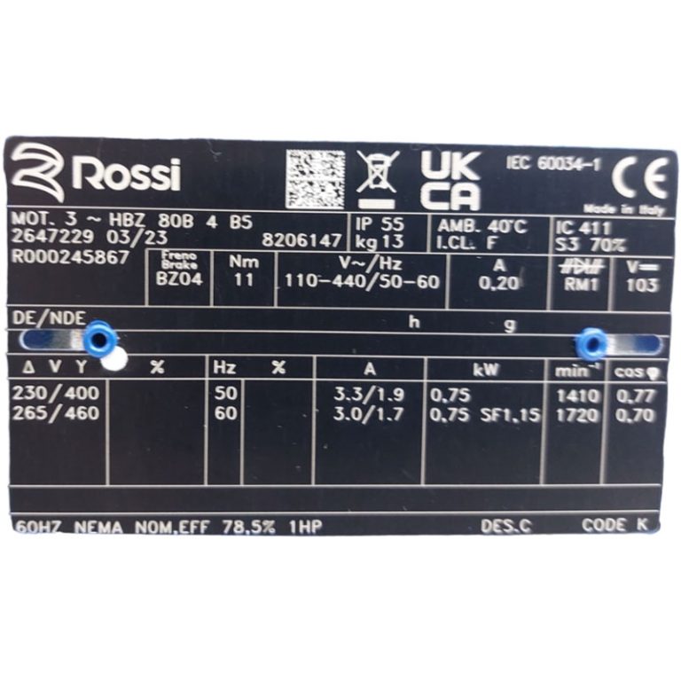 Requiere mas informacion sobre MOTOR AUTOFRENANTE HBZ 80B4 IMB5 KW=0.75 RPM=1750 V=230/400 HZ=50 FRENO BZ04 MARCA ROSSI R000245867? Pulse enviar mensaje para contactar a un asesor.