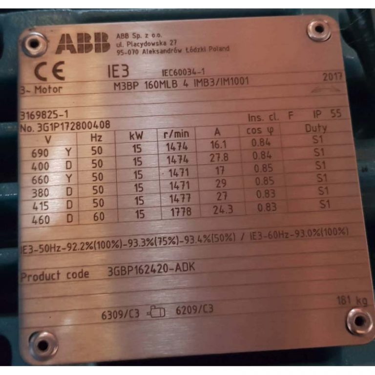 MOTOR M3BP 160MLB4 KW=15 IMB3 V=400-690 HZ=60 IE3 EN FUNDICION MARCA ABB CON GRASERAS DE