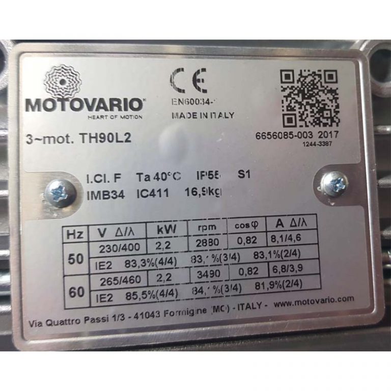 MOTOR TH90L2 IMB34 KW=2.2/2.6 RPM=2880/3490 230-400/465/460V 50/60HZ MARCA MOTOVARIO