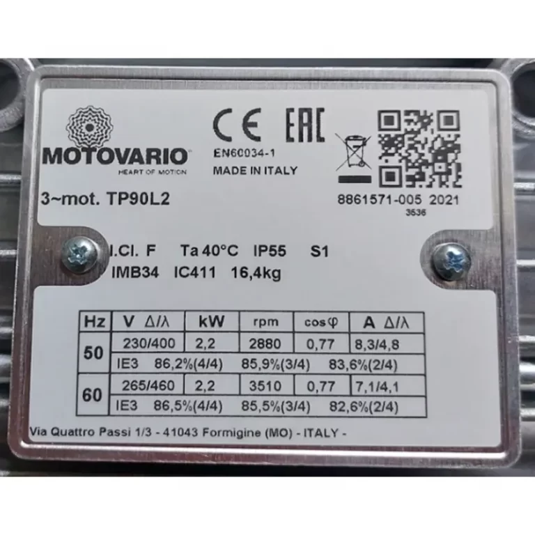 MOTOR TP90L2 IMB34 KW=2.2/2.6 RPM=2880/3490 230-400/265-460V 50/60HZ IE3 MARCA MOTOVARIO