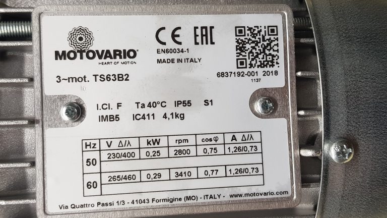 MOTOR TS63B2 IMB5 KW=0.25/0.29 V=230-400 /265-460 HZ=50/60 IE1 MARCA MOTOVARIO