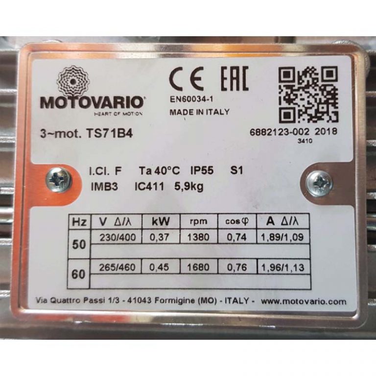 MOTOR TS71B4 IMB3 KW=0.37/0.45 RPM=1380/1680 V=230-265/400-460 HZ=50/60 MARCA MOTOVARIO
