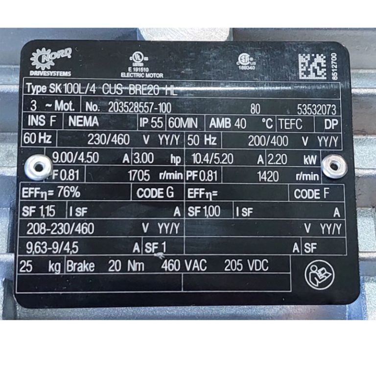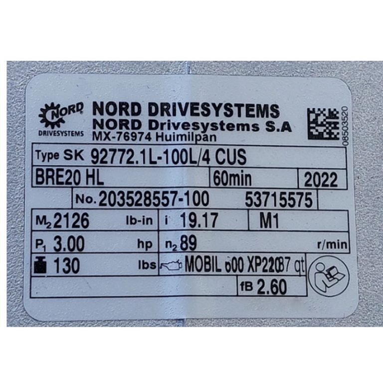 MOTOREDUCTOR SK92772.1L-100L/4 CUS BRE20 HL I=1:19.17 C/MOT 3HP 4P 230/460V MARCA NORD