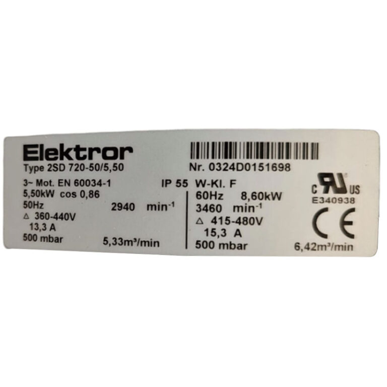 Requiere mas informacion sobre SOPLADOR TIPO 2SD 720-50/5.50 KW=5.5/8.6 360-440/415-480V 50/60HZ 2940/3460RPM ELEKTROR? Pulse enviar mensaje para contactar a un asesor.